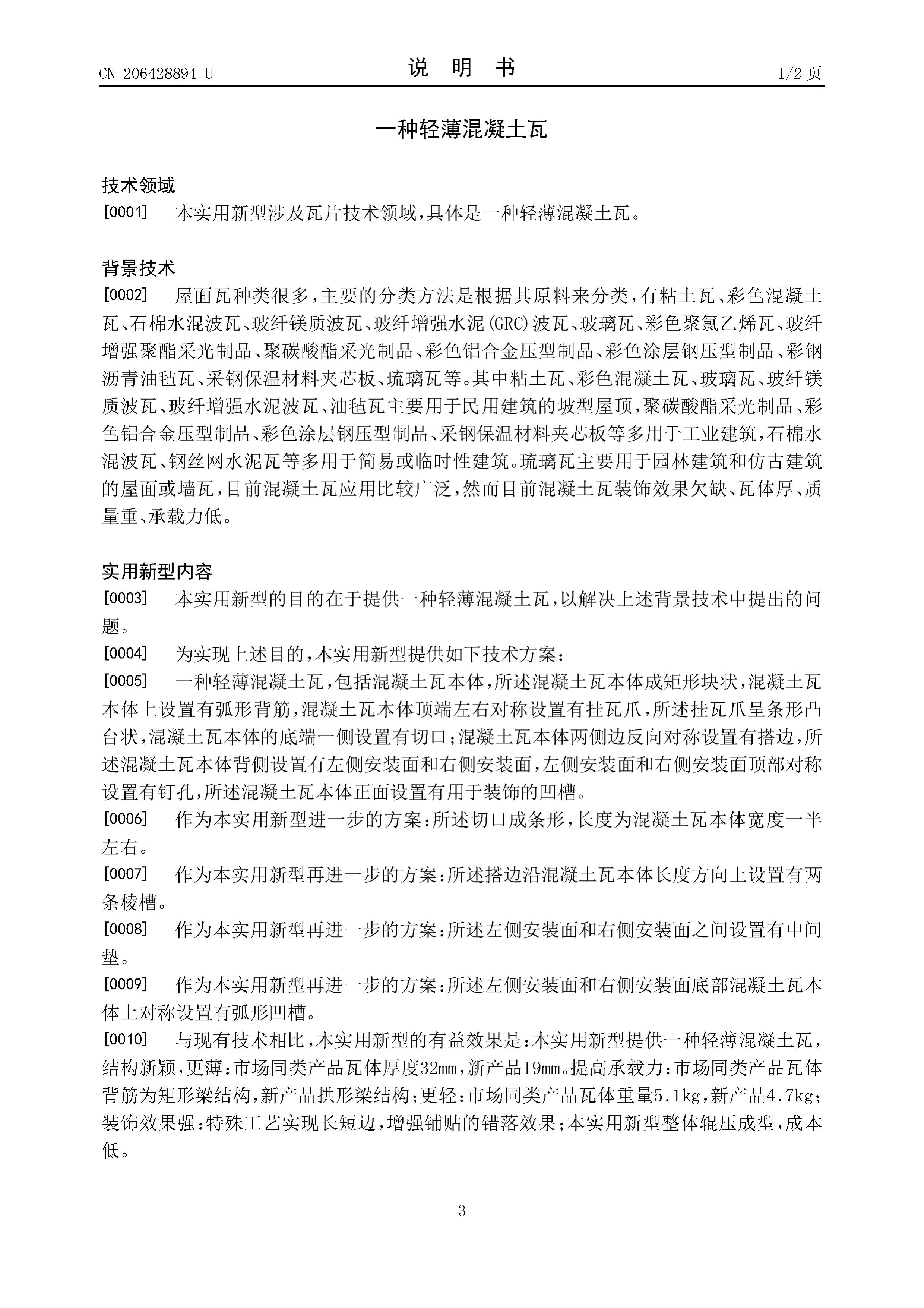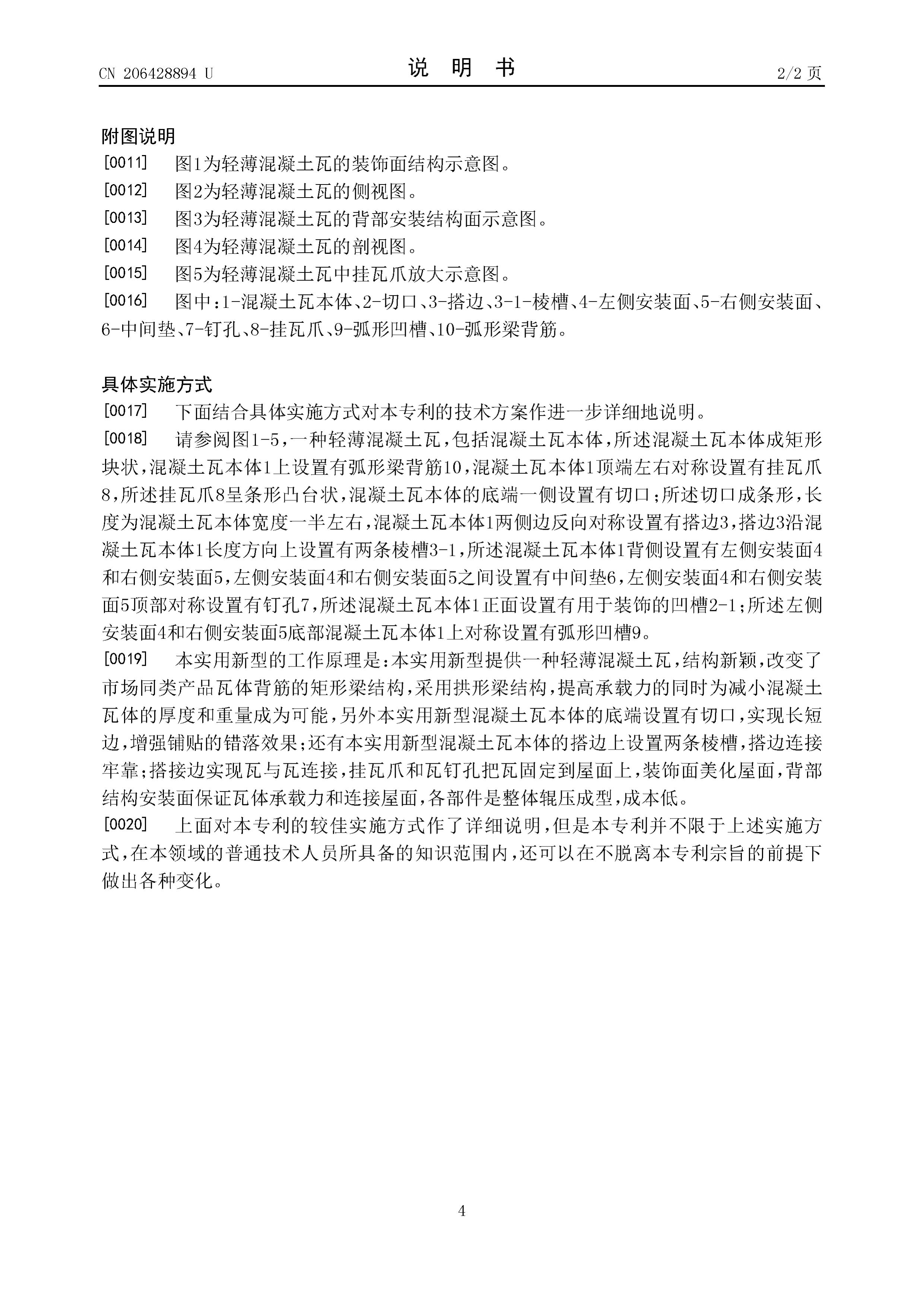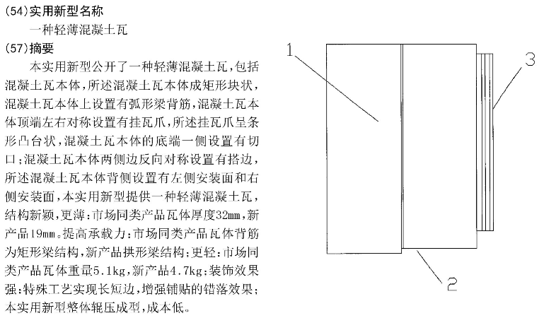 5.根據權利要求1所述的輕薄混凝土瓦,其特征在于,所述左側安裝面和右側安裝面底部混凝土瓦本體上對稱設置有弧形凹槽。